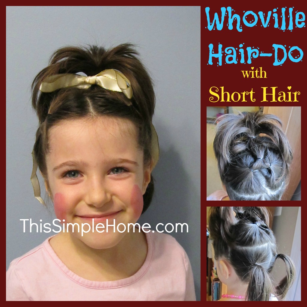 Her hair is short enough, the best I could do was a pony tail on top, plus two more in the back. In case I don't get around to sharing how I did it in its own post, I put her shoulder-length hair into eight ponytails, with four on each side. I then pulled the ponytails that were side-by-side into one ponytail, and eventually brought six ponytails together to form the "cascading" ponytail on top of her head, leaving two in the back to be a bit goofy. It may not be the typical Whoville hair, but it was cute and different enough from her norm that I was satisfied.